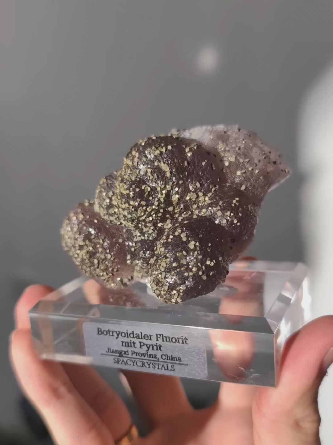 ✦ wunderschöne und seltene botryoidale Formation von Fluorit mit starkem Glanz in einem Flieder-Farbton mit angewachsenen kleinen funkelnden Pyrit Kristallen