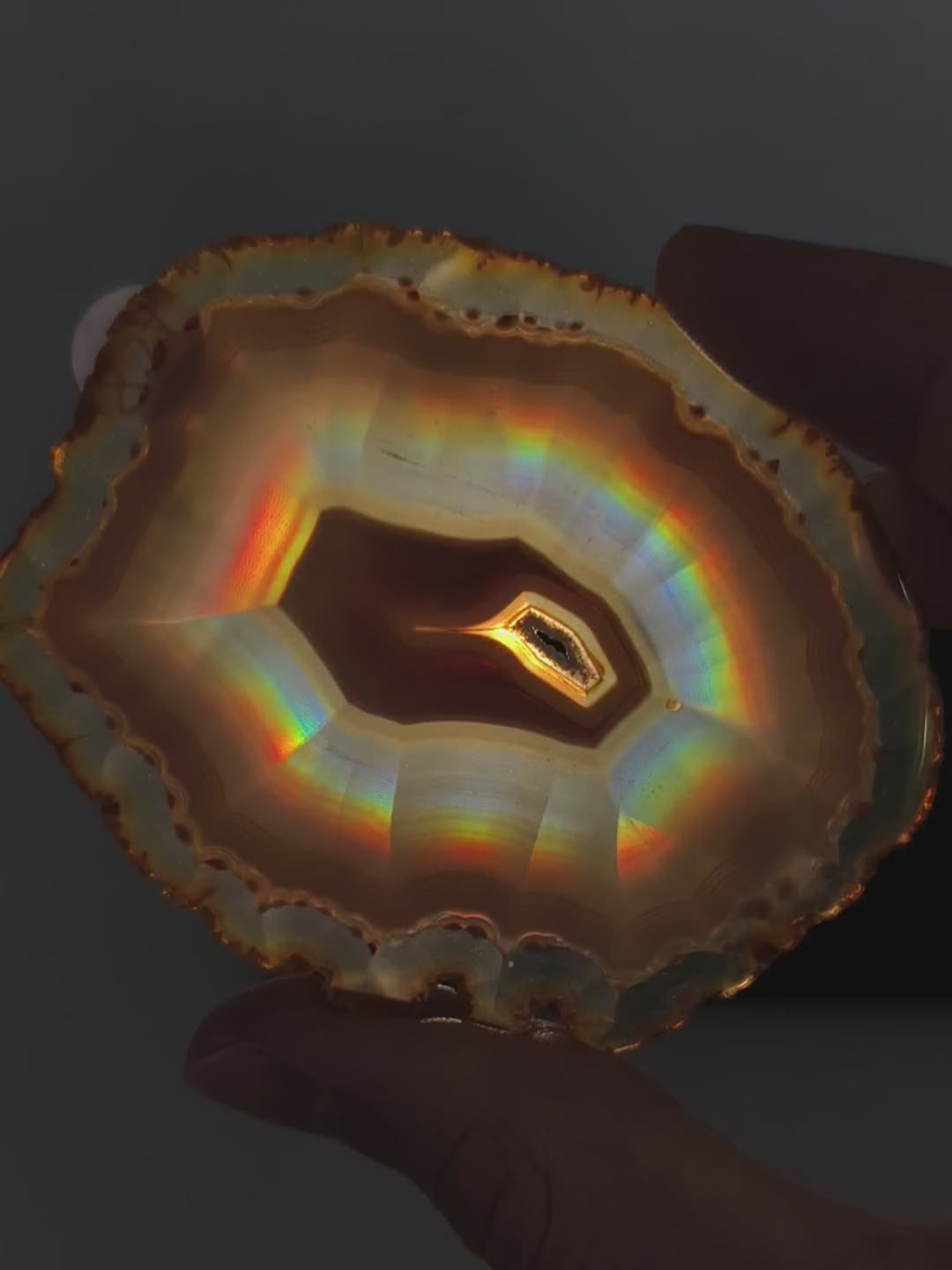 ✦ Iris Achat Scheibe aus Indonesien - zeigt beeindruckende Regenbögen wenn Licht durch die Scheibe scheint. Im Video hab ich sie mit Handy Blitzlicht von hinten beleuchtet.